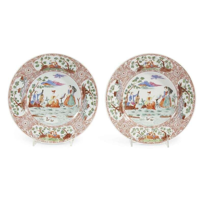 A pair of Chinese Dutch-style porcelain dishes decorated with trio of musicians 19th/20th century
