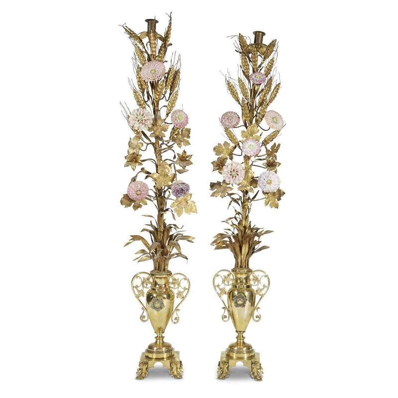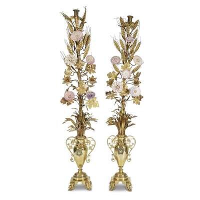 The brass urn-form bases issuing a central standard of gilt and pressed metal vines, flowers, and wheat chaffs mounted with pink and violet glazed dahlias and carnations terminating in a single candle nozzle. (2).