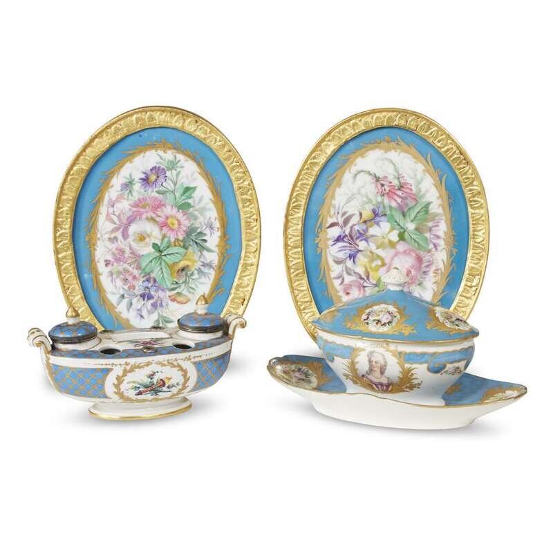Comprising a pair of framed oval plaques, a sauce tureen, and an encrier; with spurious Sèvres style style marks to underside. (4).