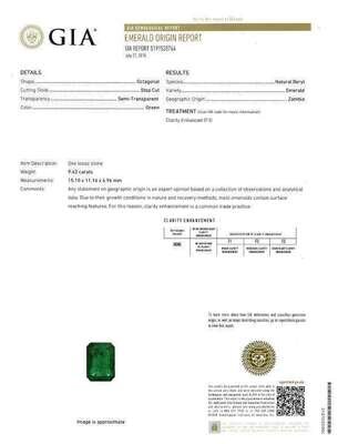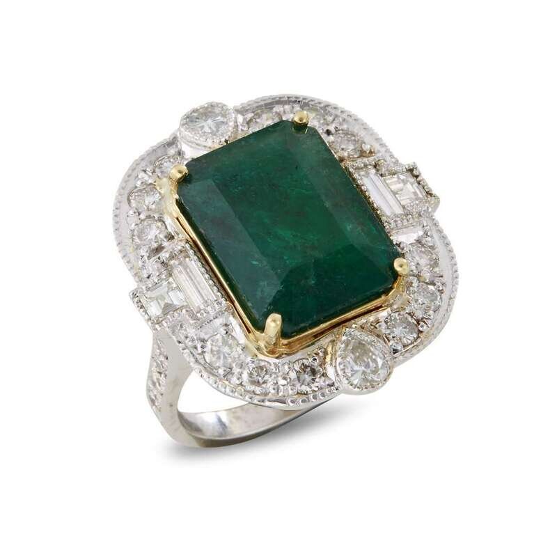 centering an emerald-cut emerald, weighing 9.43 carats surrounded by baguette-cut diamonds; estimated total diamond weight: 1.85 carats, mounted in eighteen karat white gold.