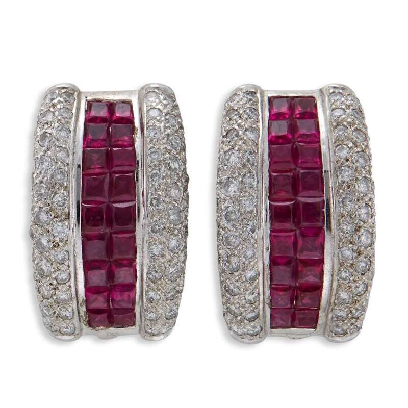 centering square-cut rubies, bordered by round brilliant-cut diamonds; estimated total diamond weight: 1.30 carats.