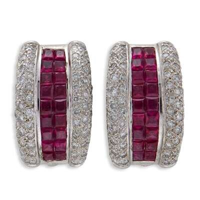 A pair of diamond, ruby, and eighteen karat white gold earrings