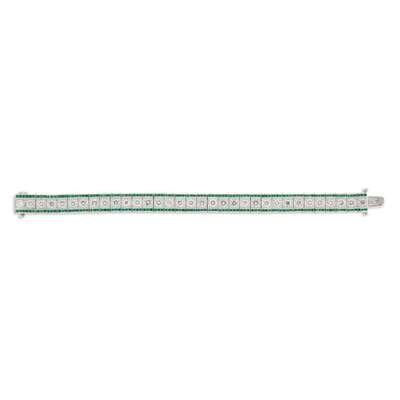 set throughout with round brilliant-cut diamonds; estimated total diamond weight: 8.40 carats, bordered by French-cut emeralds.
