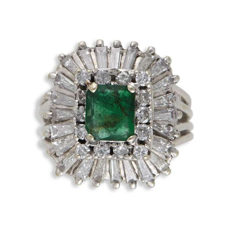 set with an emerald-cut emerald measuring approximately 6.80mm x 6.00mm within a round brilliant-cut and tapering baguette mount; estimated total diamond weight: 1.25 carats, mounted in fourteen karat white gold.