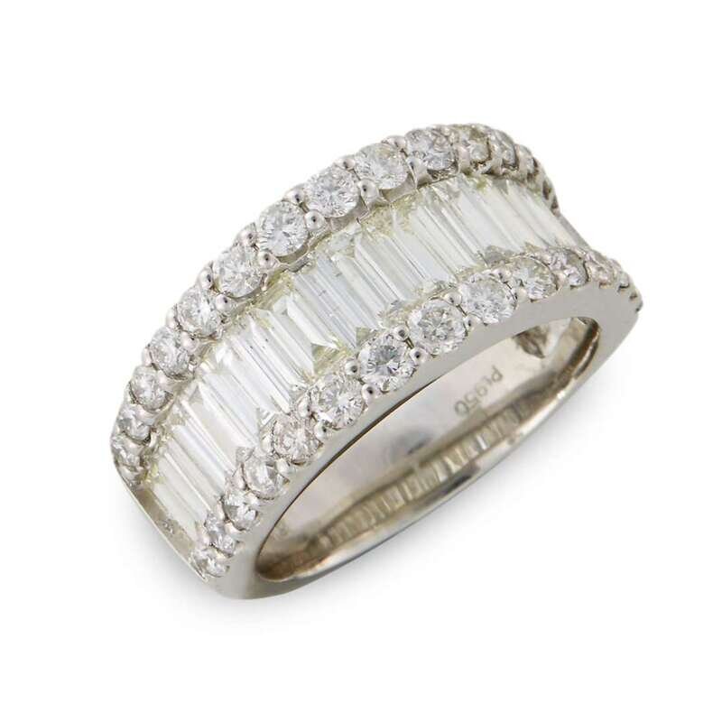 center row set with baguette-cut diamonds bordered by round brilliant-cut diamonds; estimated total diamond weight: 3.00 carats, mounted in platinum.