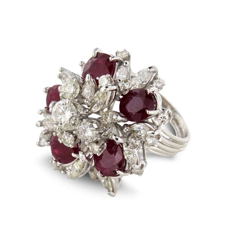 centering a round brilliant-cut diamond, weighing approximately 0.65 carat, highlighting five oval and round-cut rubies; estimated total ruby weight: 5.25 carats, accented by marquise and round brilliant-cut diamonds; estimated total remaining diamond weight: 3.80 carats.