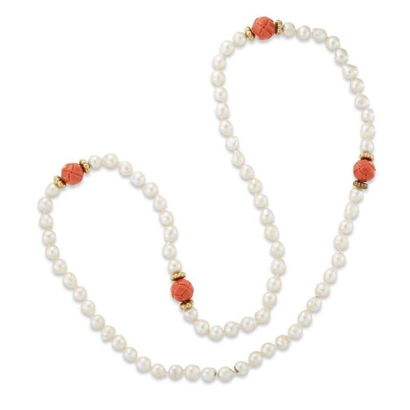 comprised of pearls measuring approximately 8.80mm-8.50mm, carved coral beads measuring approximately 13.90mm, and fourteen karat gold spacers.