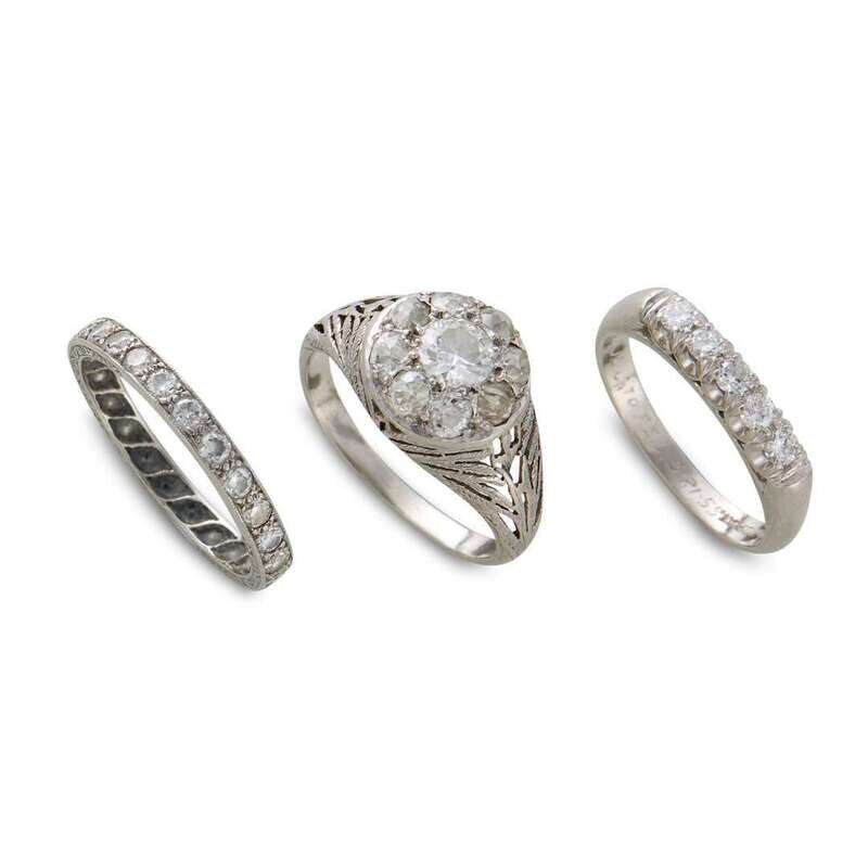 one with five diamonds across the top, set in platinum; one channel set, full circle diamond ring with scroll work on the edges (2.7mm); one with center diamond surrounded by eight smaller diamonds.