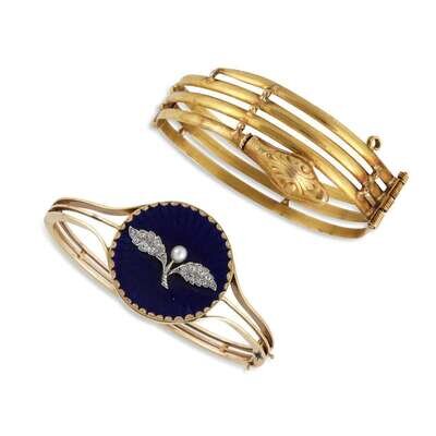 one with blue enamel disc and diamond and pearl overlay, the other designed as a coiled snake, hinged.