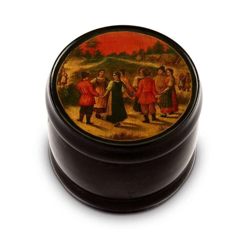 A Russian Lacquer Round Tea Caddy “Round Dance in the Country” Vishnyakov & Sons, Ostashkovo, ca. 1880