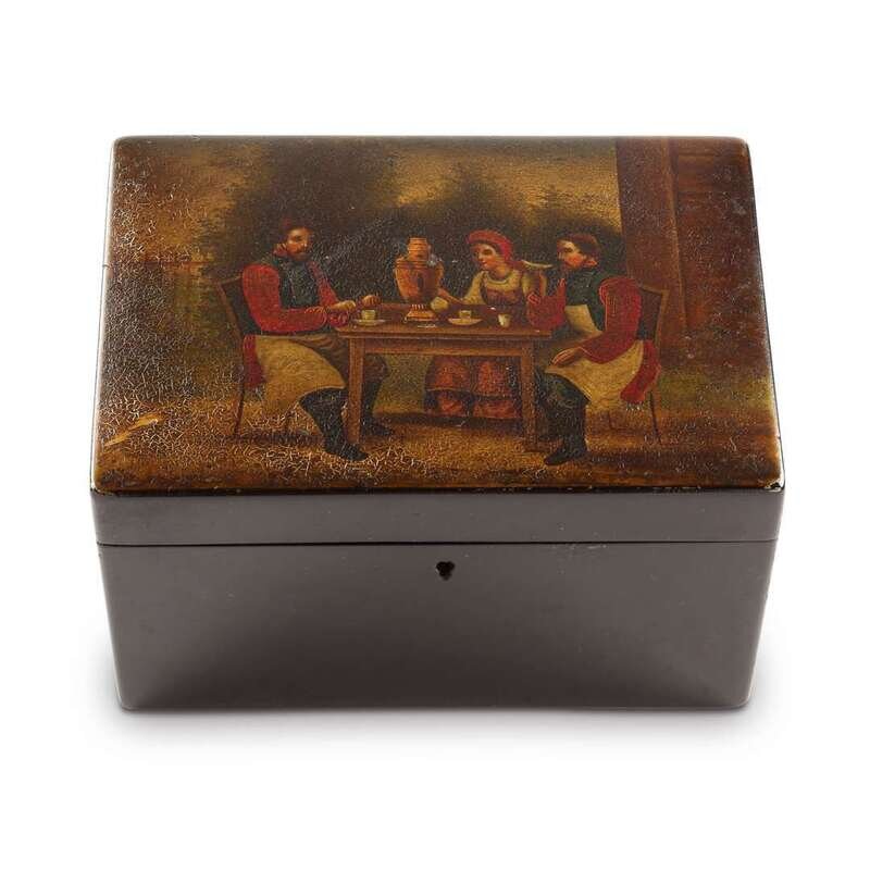 A Russian Lacquer Locking Tea Caddy "Peasants at the Samovar" Vishnyakov & Sons, Ostashkovo, ca. 1882