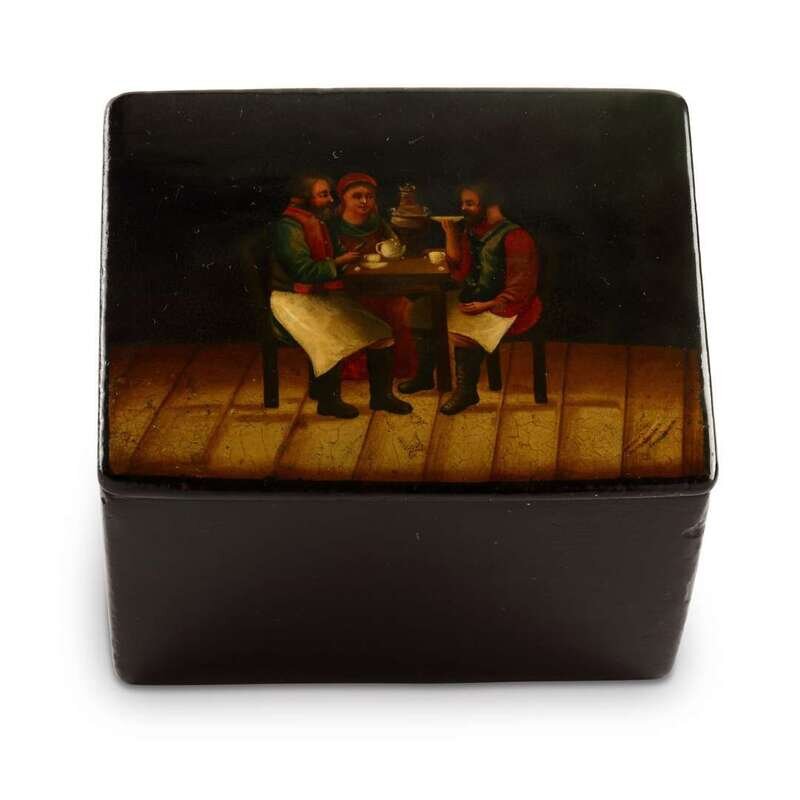 A Russian Lacquer Tea Caddy “Peasants Drinking Tea from Saucers” Vishnyakov & Sons, Ostashkovo, ca. 1880