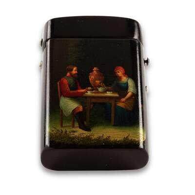 A Russian Lacquer Étui-form Cigarette Case “Peasants at the Samovar” Lukutin Factory, Fedoskino, ca. 1863-1876