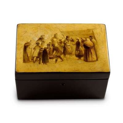 A Rare Russian Grisaille Lacquer Box “In the Village: Market Day” Vishnyakov & Sons, Ostashkovo, ca. 1880