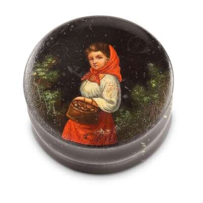 A Russian Lacquer Round Box “Gathering Mushrooms” Lukutin Manufactory, Fedoskino, ca. 1910