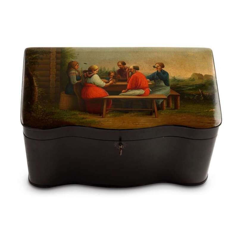 A Russian Lacquer Shaped Locking Tea Caddy "The Family Dinner" Lukutin Manufactory, Fedoskino, ca. 1880-1902