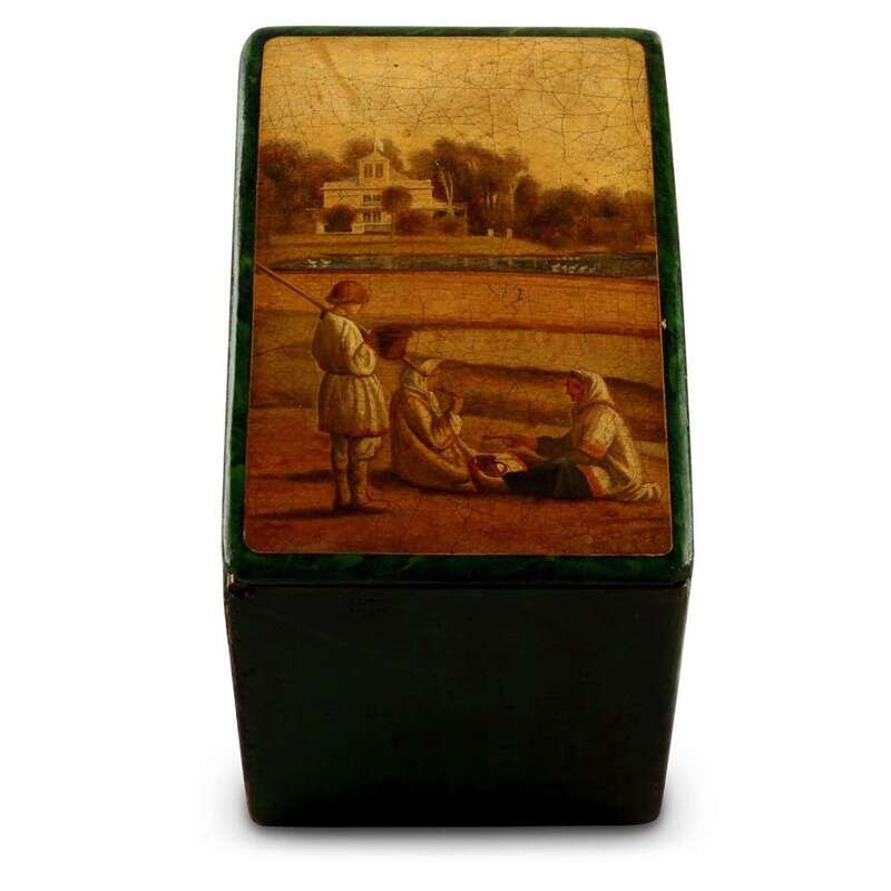 A Russian Lacquer box “Peasants at rest on the Estate” Vishnyakov & Sons, Ostashkovo, ca. 1870-1880