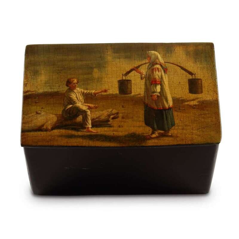 A Russian Lacquer Casket "Fetching water by the River" Vishnyakov & Sons, Ostashkovo, ca. 1870