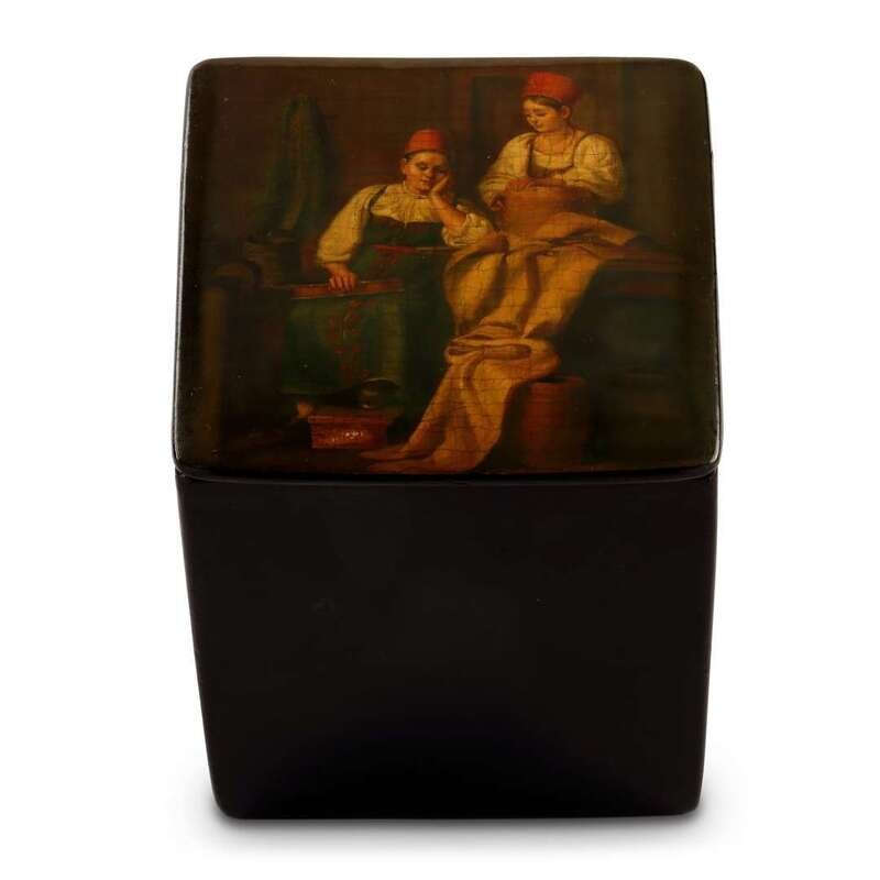 A Russian Lacquer Box "In the Dairy: Cheesemaking" Vishnyakov & Sons, Ostashkovo, 1870-1880