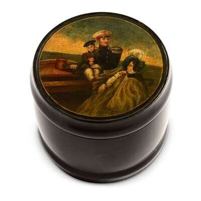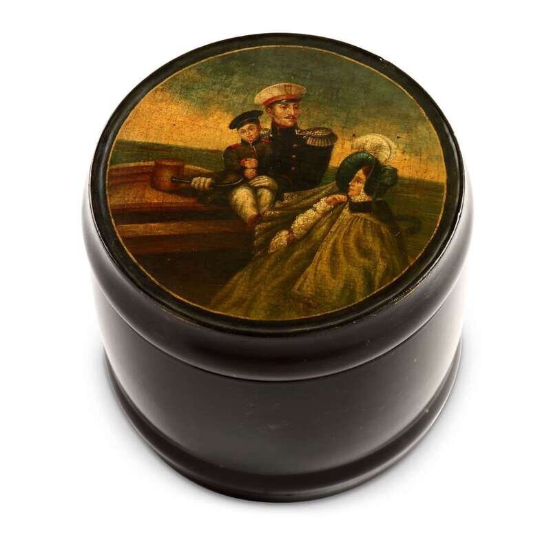 A Russian Lacquer Tobacco Box after print "Emperor Nicholas I and Empress Alexandra Fyodorovna en famille on a boat." vishnyakov & sons, ostashkovo, ca. 1880