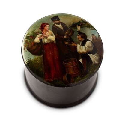 A Russian Lacquer Round Box “Peasants at rest: Drinking Water” Lukutin Factory, Fedoskino, ca. 1863-1876