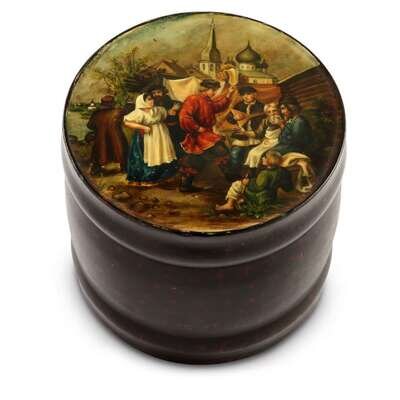 A Russian Lacquer Barrel Form Tea Caddy “Celebrations at a Feast Day” Vishnyakov & Sons, Ostashkovo, ca. 1880