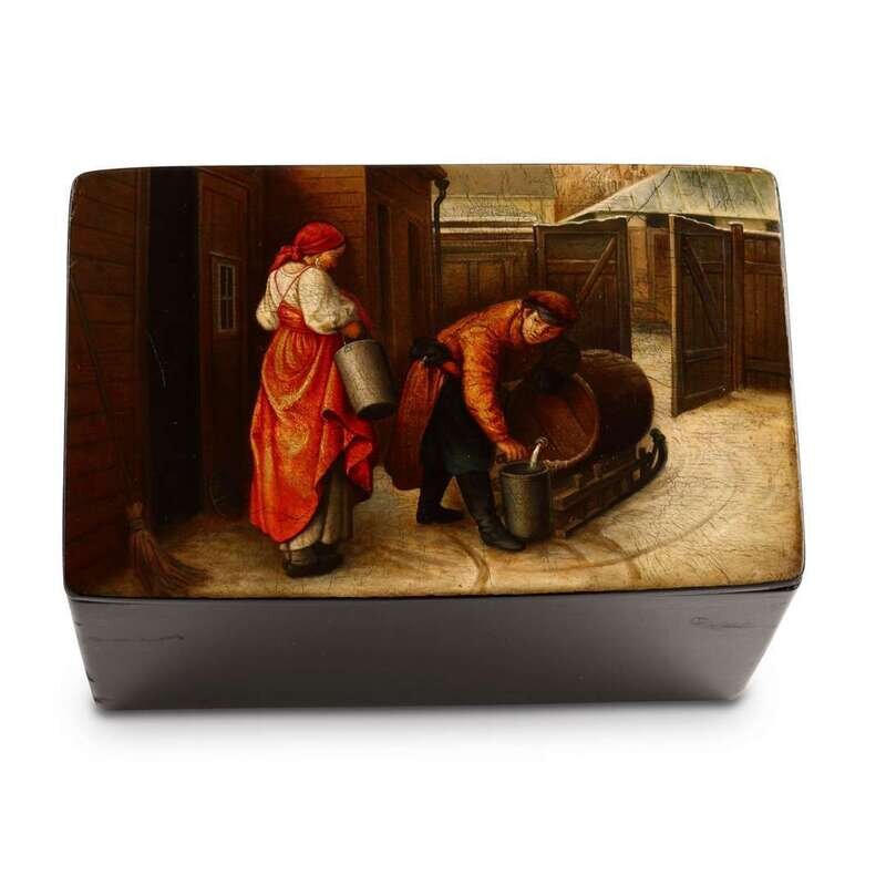 A Russian Lacquer Box “The Water-Seller” Lukutin Manufactory, Fedoskino, ca. 1910-1920