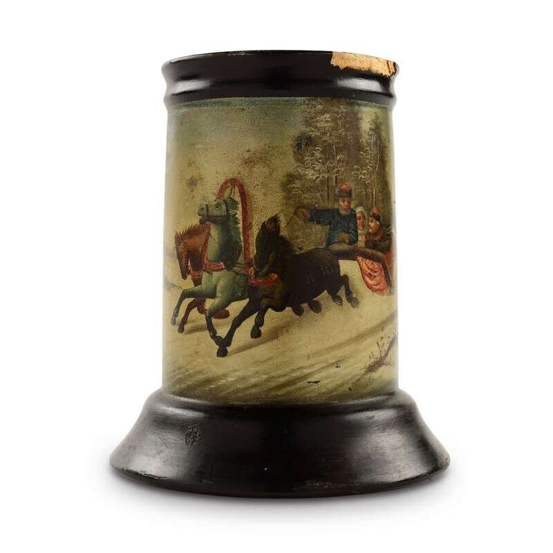 A Russian Lacquer spill vase, "Figures in a Troika" Vishnyakov & Sons, Ostashkovo, 1880