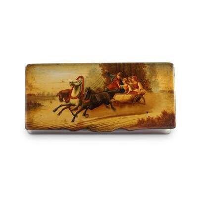 A Russian Lacquer Box “Autumn: Revelers in a Troïka” Lukutin Factory, Fedoskino, ca. 1888-1902