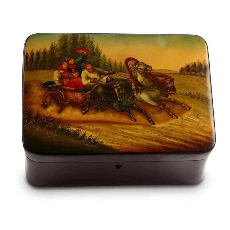 A Russian Lacquer Box “Autumn: Peasants in a Troïka” Vishnyakov & Sons, Ostashkovo, ca. 1880