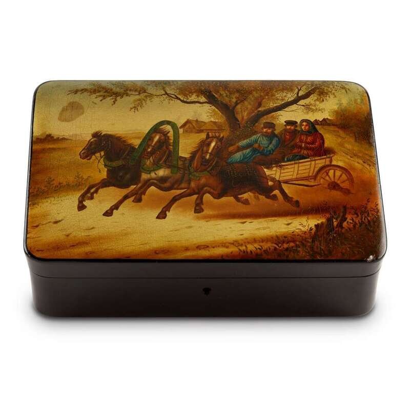 A Russian Lacquer Casket “Autumn: Peasant Couple in a Troïka” Vishnyakov & Sons, Ostashkovo, ca. 1880-1890