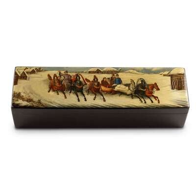 A Russian Lacquer Casket or Pencil Case “Two Troïki in a Winter Landscape” Vishnyakov & Sons, Ostashkovo, ca. 1870-1880