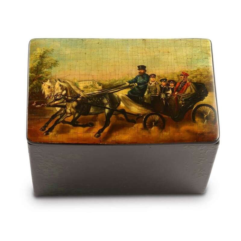 A Russian Lacquer Box after Sverchkov's "A Drive in a Carriage (Alexander II with his sons)" Vishnyakov & Sons, Ostashkovo, ca. 1880-1890