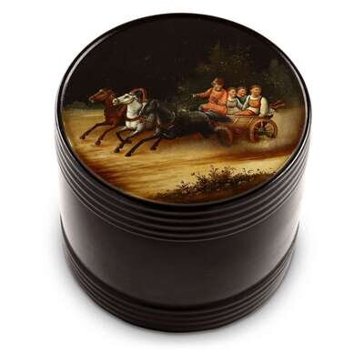 A Russian Lacquer Barrel-form Tea Caddy "Autumn: A Troïka Ride" Vishnyakov & Sons, Ostashkovo, ca. 1880