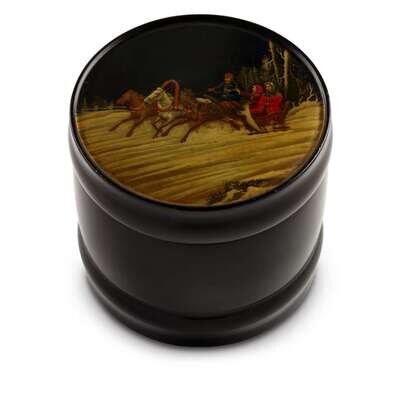 A Russian Lacquer Barrel-form Tea Caddy "Troika Ride" Vishnyakov & Sons, Ostashkovo, ca. 1880