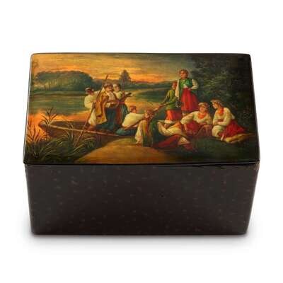 A Russian Tortoise Ground Lacquer Box, "Rendezvous on the Shore of the River". Vishnyakov & Sons, Ostashkovo. ca. 1880-1890.