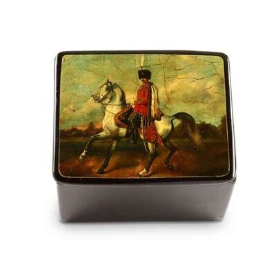 A Russian Lacquer Box after Sverchkov's "Equestrian portrait of Emperor Alexander II in the uniform of the Life Guards Hussar Regiment" Vishnyakov & Sons, Ostashkovo, after 1870