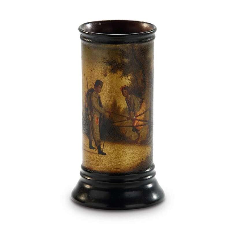 A Russian Lacquer Spill Vase "Soldier and His Sweetheart at the Fence" Vishnyakov & Sons, Ostashkovo, ca. 1870