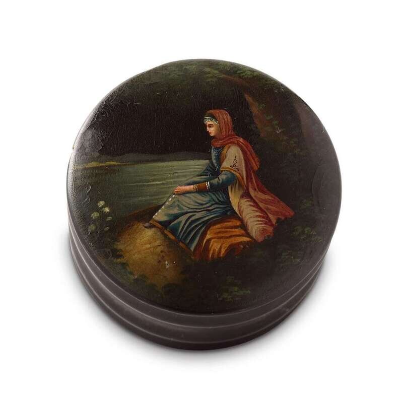A Russian Lacquer Snuffbox "Boyarina by a River" Vishnyakov & Sons, Ostashkovo, ca. 1880-1890