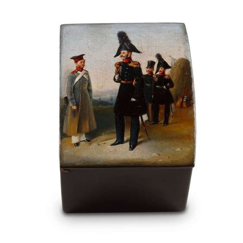 A Russian Lacquer Box “Alexander II meets a new recruit” Vishnyakov & Sons, Ostashkovo, circa 1870