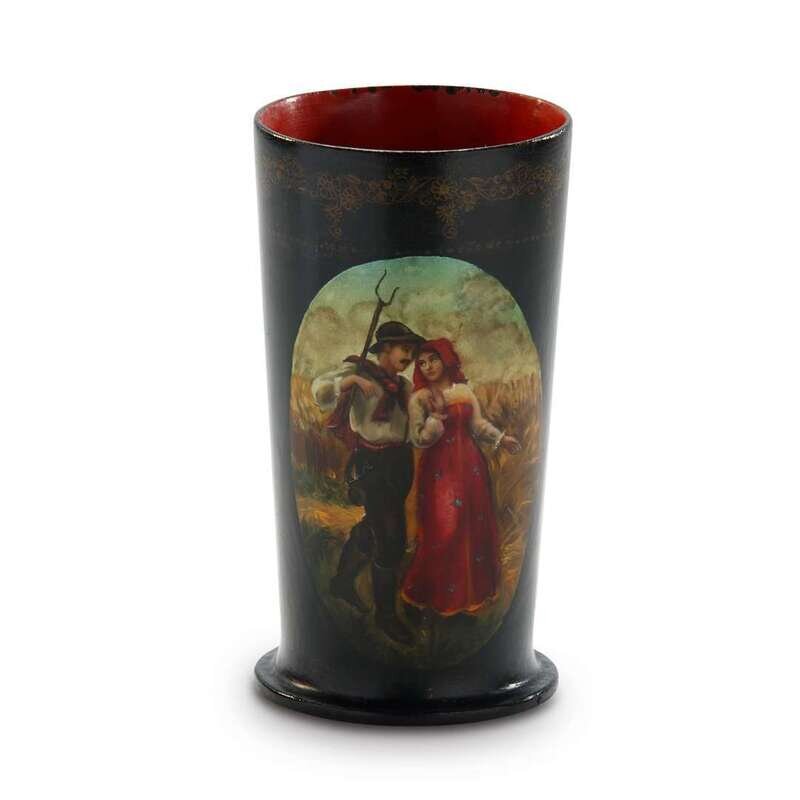 A Russian Lacquer Spill Cup or Beaker “Young lovers in the fields” Vishnyakov & Sons, Ostashkovo, ca. 1880