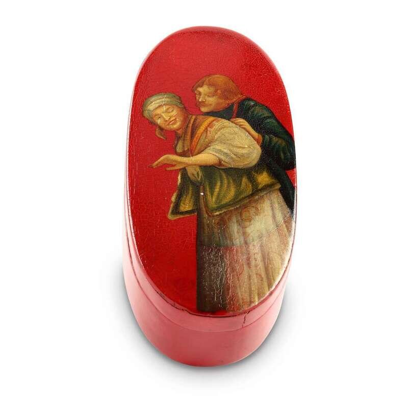 A Russian Oval Red Ground Lacquer Box “An Amorous Couple” unknown maker, likely moscow, ca. 1880