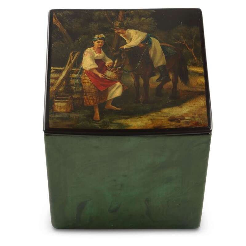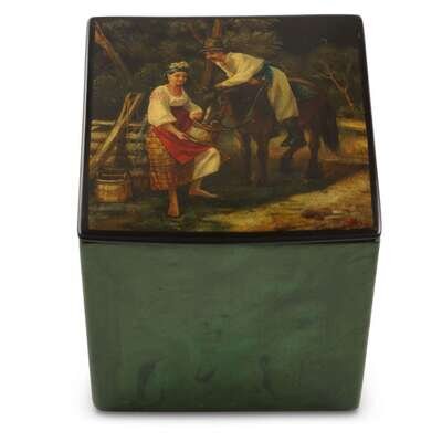A Russian Malachite-Ground Lacquer Tea Caddy "The Meeting at the Well" Vishnyakov & Sons, Ostashkovo, ca. 1880