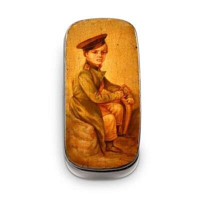 A Russian Lacquer Snuffbox "Young Cadet (Tsesarevich Nicholas Alexandrovich)" Lukutin Manufactory, Fedoskino, ca. 1843-1863