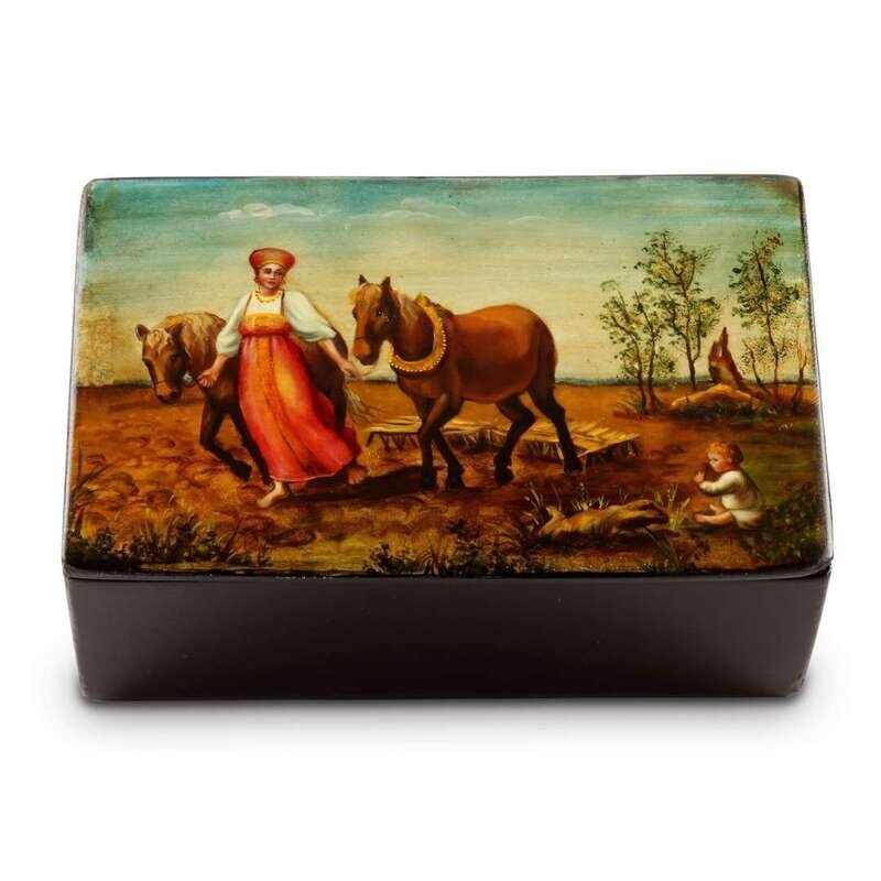 A Russian lacquer Box depicting Venetsianov's "Ploughing Spring" Vishnyakov & Sons, Ostashkovo, 1880-1890