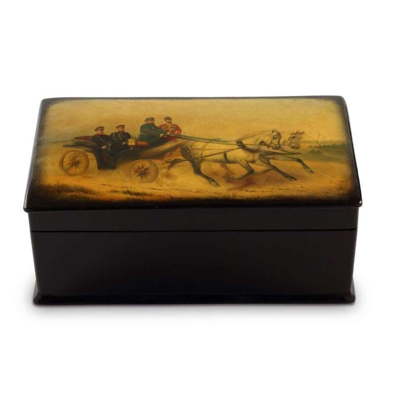 A Russian Lacquer Casket after Sverchkov, "The Emperors Alexander III and Wilhelm II in a Landau" Lukutin Manufactory, Fedoskino, ca. 1888-1902