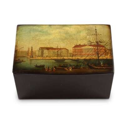 A Russian Lacquer Casket "View of the Old St. Petersburg Trading Shipyard" Vishnyakov & Sons, Ostashkovo, ca. 1870-1880