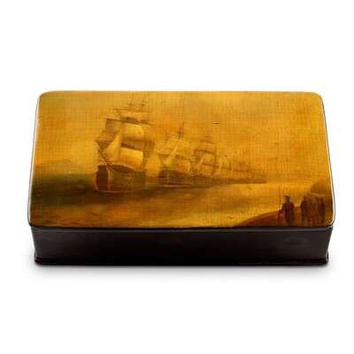 A Russian Lacquer Casket after Aivazovsky’s “Parade of the Black Sea Fleet in 1849” Lukutin Factory, Fedoskino, ca. 1863-1876
