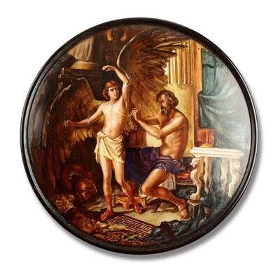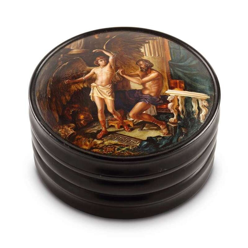 A Russian Round Lacquer Box after Buchholz’ “Dedalus attaches wings to his son Icarus” Vishnyakov & Sons, Ostashkovo, after 1880-1900
