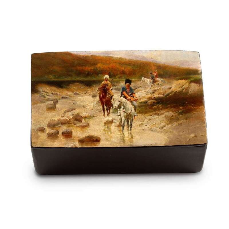 A Russian Lacquer Box after Roubaud's "Cossacks in a Mountain Creek" Vishnyakov & Sons, Ostashkovo, after 1890